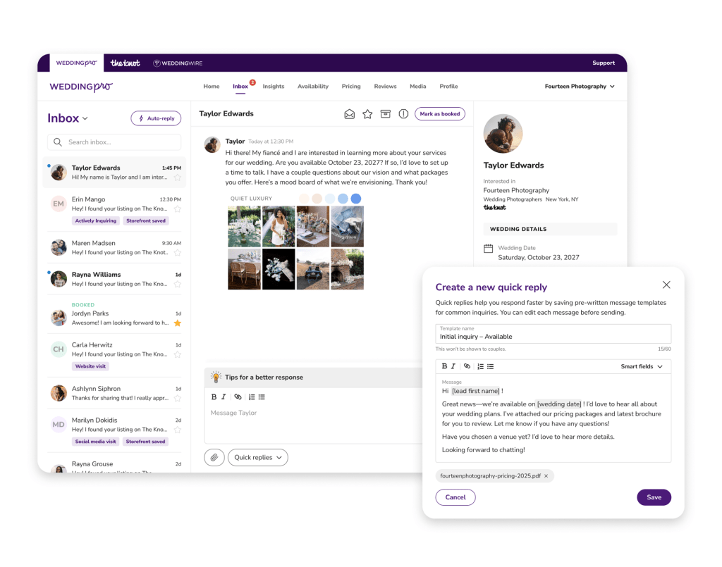 The WeddingPro Inbox is designed to uplevel client communication so you can close the sale faster. Receive, organize and quickly reply to couple inquiries from The Knot and WeddingWire all in one, easy-to-use place.