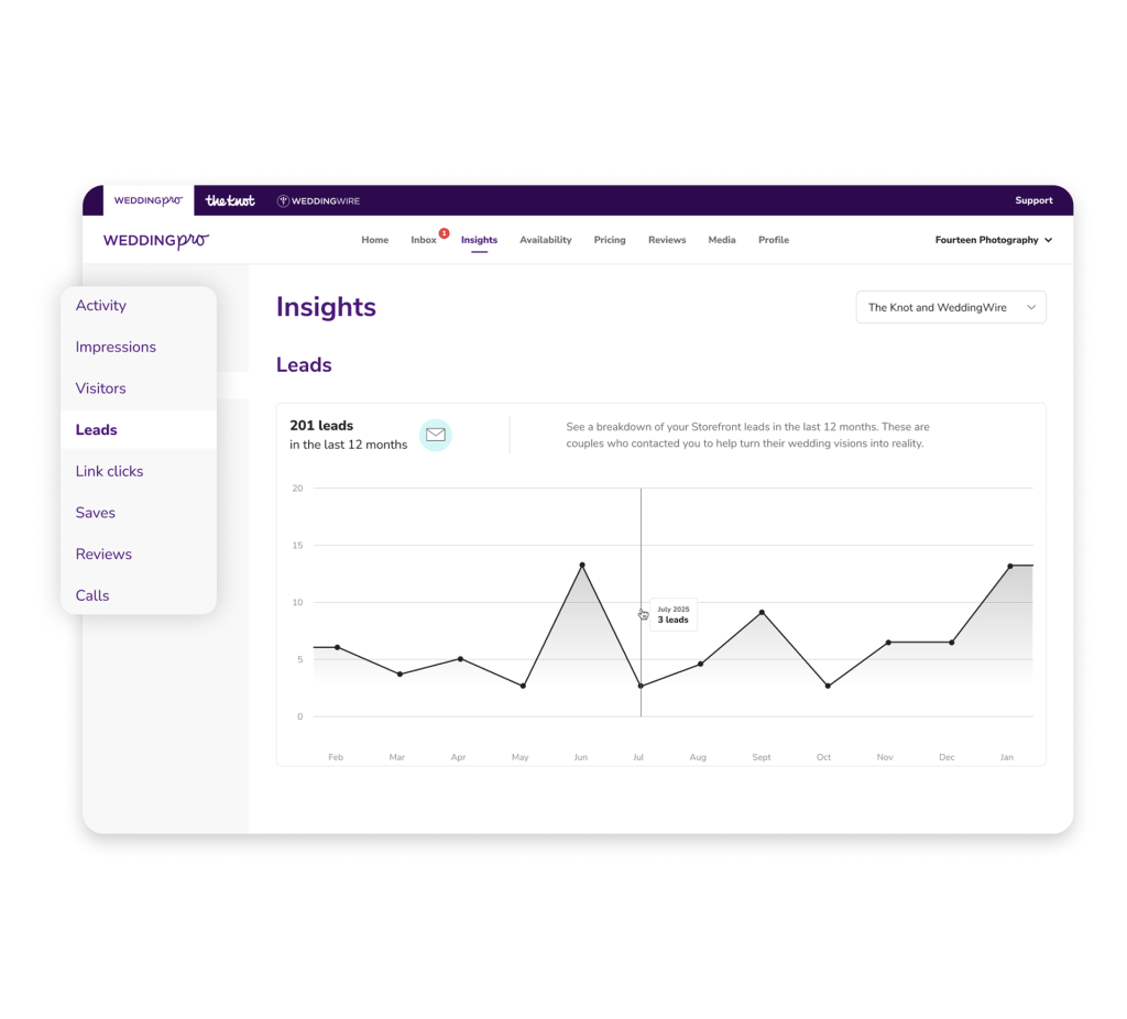 WeddingPro is the vendor-facing platform that connects you to your advertising tools on The Knot and WeddingWire. It acts as the door to your Storefronts while also providing vital information about your account with tools like Insights, connecting you with inquiring couples through your Inbox, and delivering education and business support.