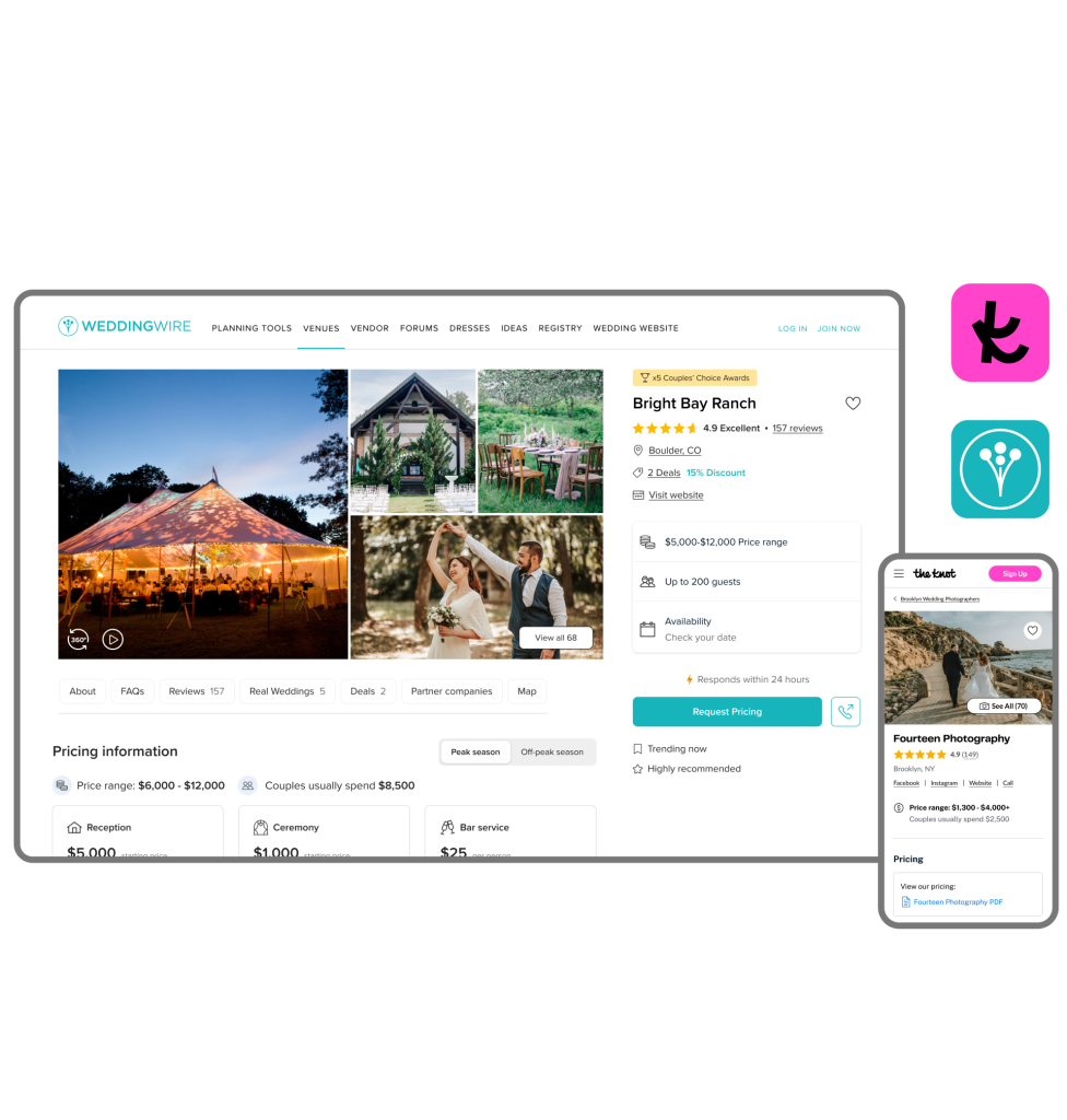 Every wedding business is different, so there are a lot of factors to consider when determining the price of advertising with The Knot and WeddingWire. Pros typically see a positive ROI after booking just a few weddings. Get in touch with our team so we can learn more about your business to build your package.